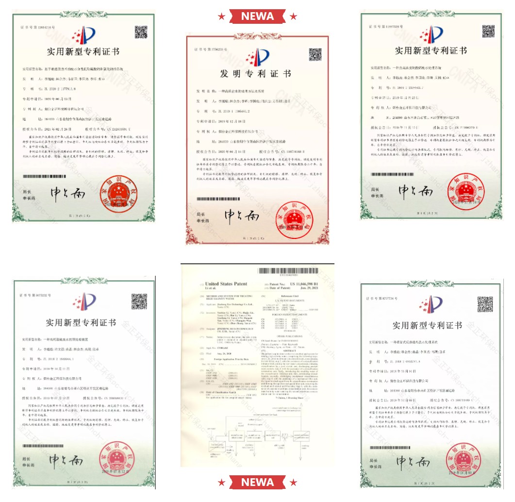 煙臺金正環(huán)保“脫穩(wěn)耦合平板膜”技術集成了先進的預處理、脫穩(wěn)結晶、平板膜技術、雜鹽資源化等先進工藝和設備,形成了獨有的工藝專利技術,具有完全自主知識產權。作為全球少數(shù)掌握膜法水處理全產業(yè)鏈企業(yè),打通了從膜材料、膜組件、膜集成系統(tǒng)、工藝包、項目建設與運營、智慧水務運營和雜鹽資源化利用。副產物硫酸鈉達到GB/T6009-2014《工業(yè)無水硫酸鈉》I類一等品、硫酸鈣達到GB/T37785-2019《煙氣脫硫石膏》一級標準,回收率可達95%以上,實現(xiàn)效益最大化。目前,公司擁有膜法水處理相關專利149項,多項技術打破國外壟斷,徹底解決了“卡脖子”問題。